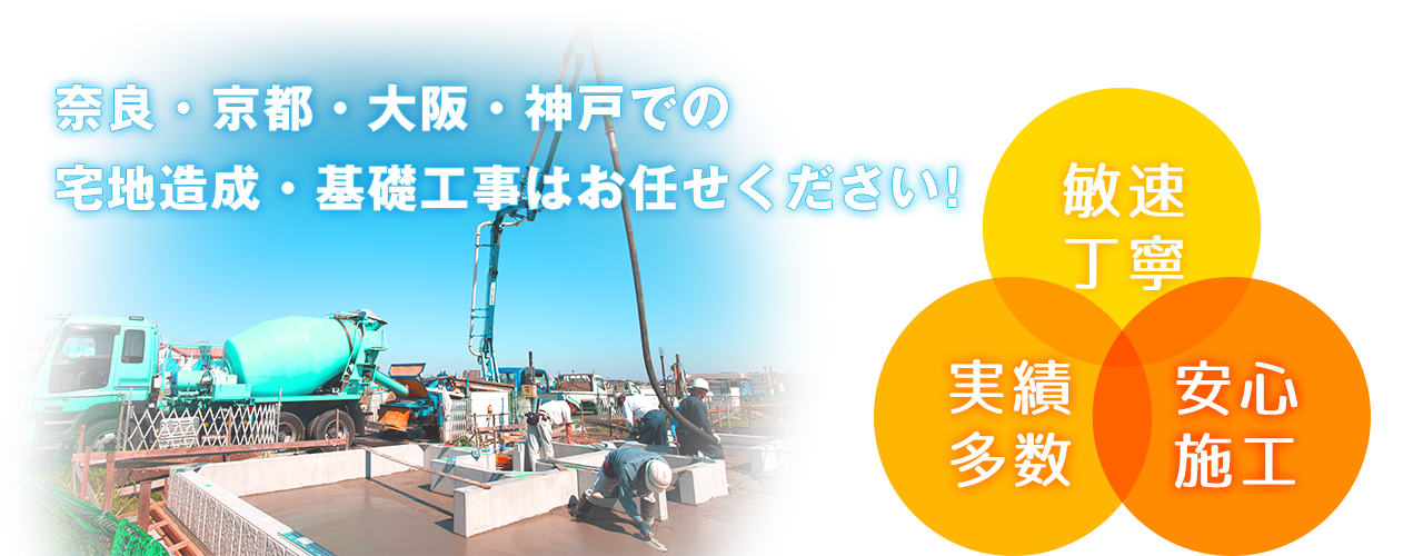 経験豊かなスタッフが、皆様のご依頼に対して確実・丁寧な施工をお約束いたします。京阪神地域で宅地造成・住宅基礎工事など土木工事なら、実績豊富な基礎屋『後藤建設』へ安心してご依頼ください。